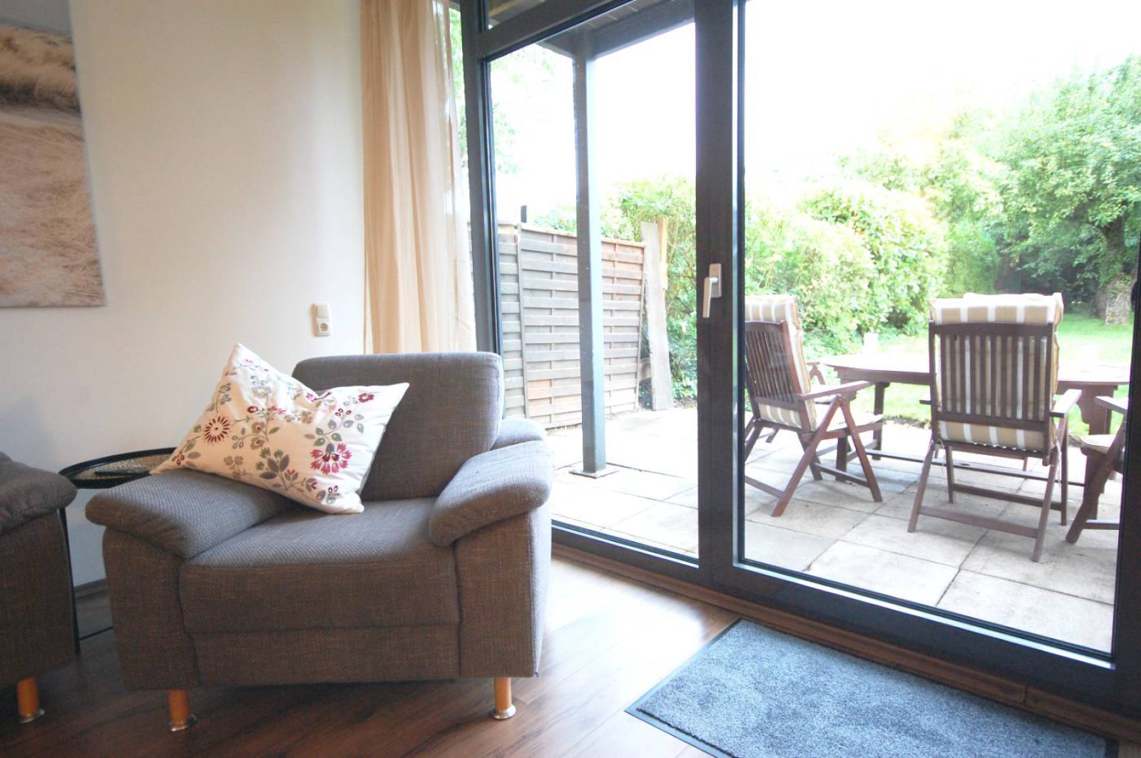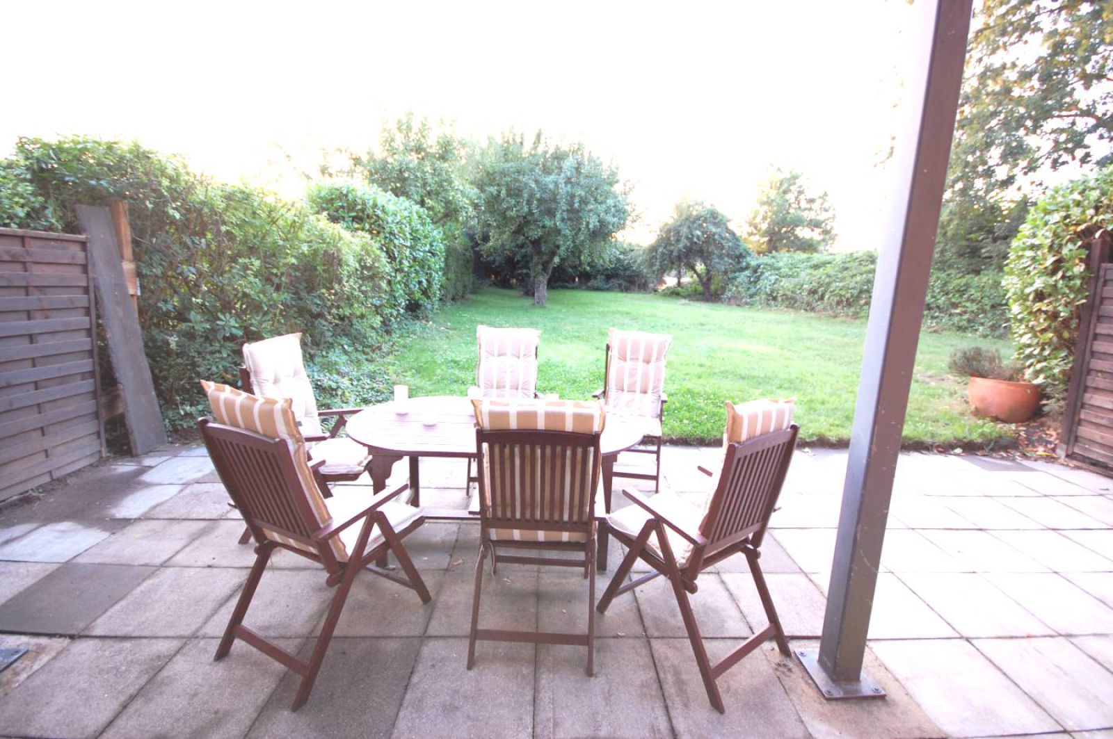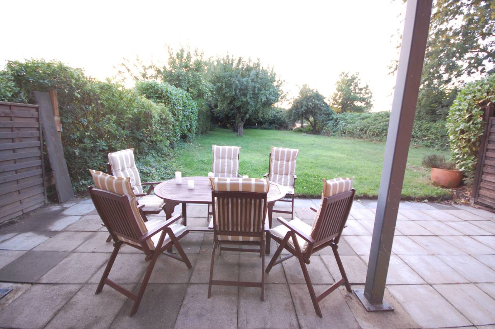 Die eingefasste Terrasse ist hinter dem Haus (Ausrichtung Südwest) und mit Tisch und 6 Stühlen, Grill ausgestattet . Mit großem Garten und Apfelbäumen.