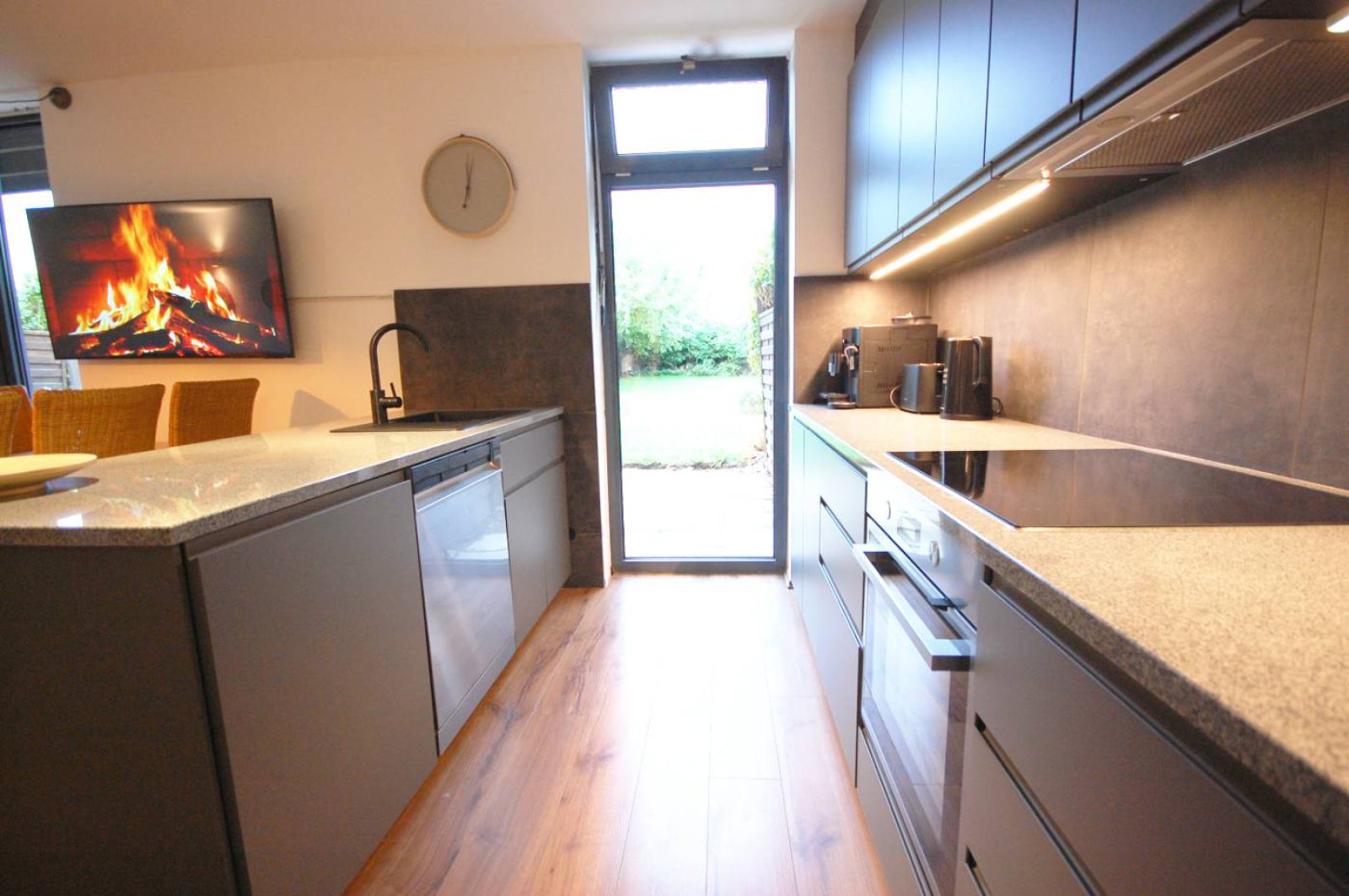 Erdgeschoss: Im hellen Wohnzimmer mit gemütlicher Sitzecke können Sie entspannte Abende genießen. Der offene Essbereich mit großem Tisch bietet reichlich Platz für gemeinsame Mahlzeiten. Die moderne Küche ist komplett ausgestattet – inklusive Backofen, Mikrowelle, Spülmaschine, Kühl-Gefrierkombination und eleganter Granitarbeitsfläche – ideal für alle, die gerne kochen.